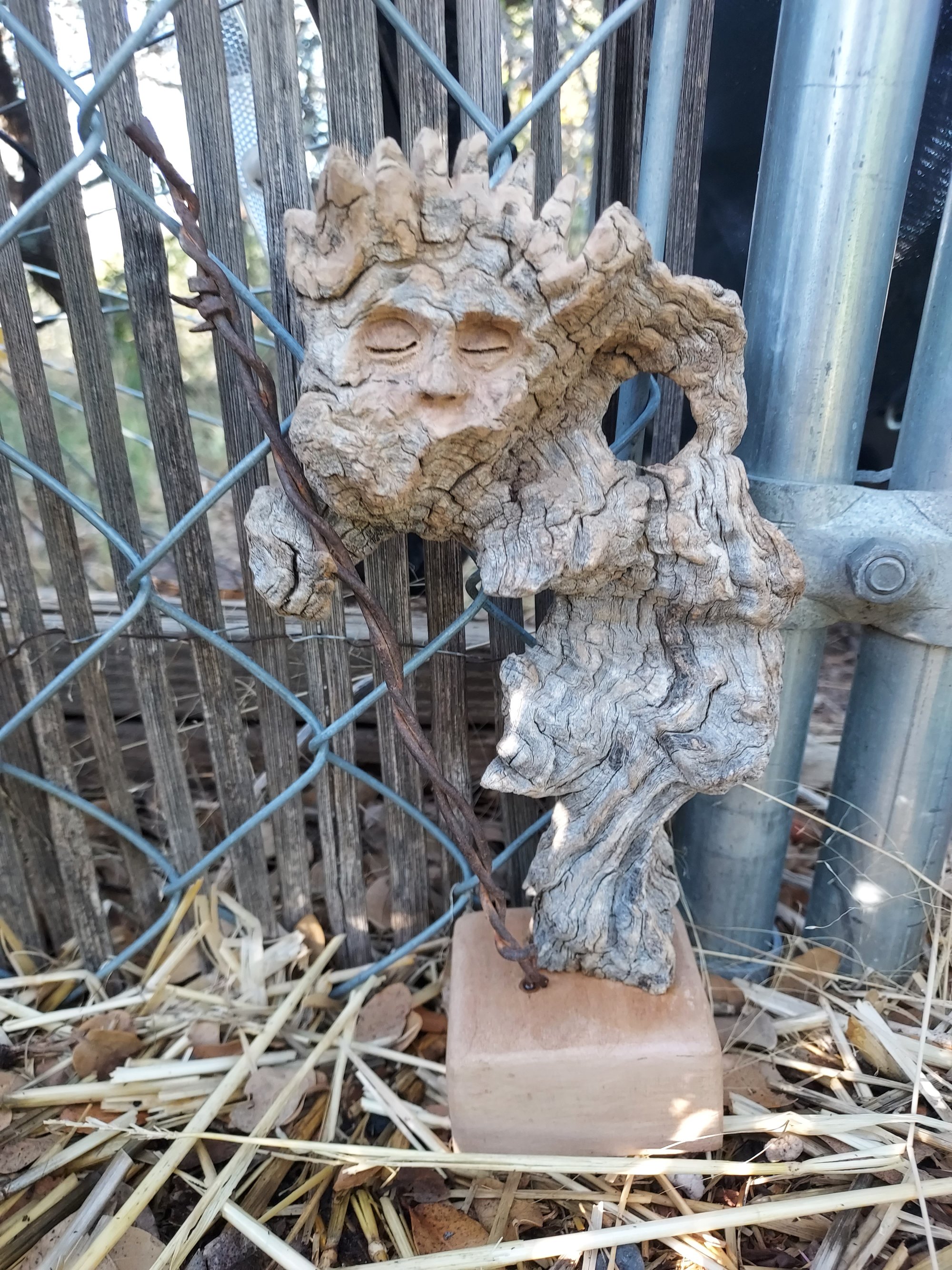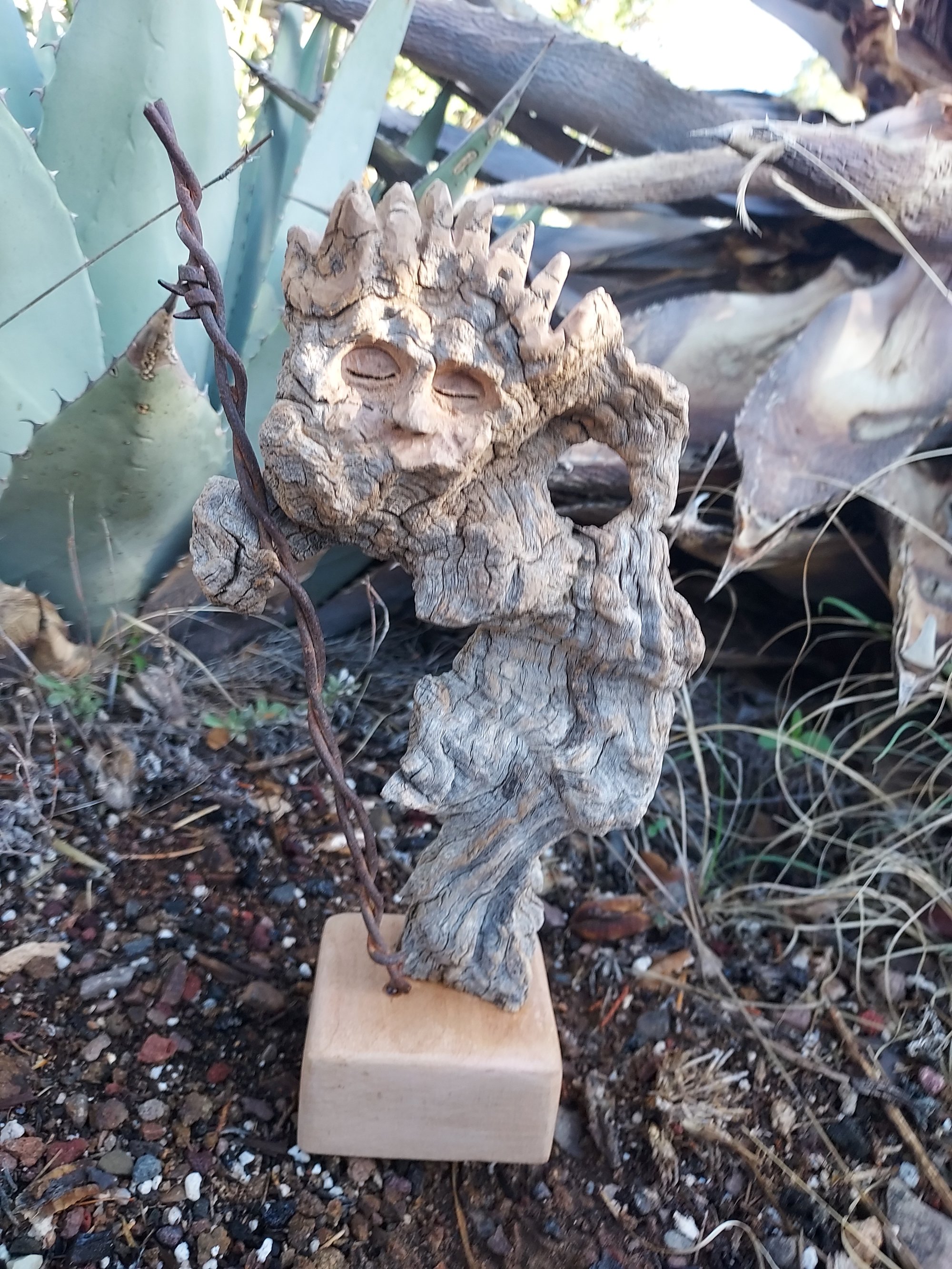 This piece is made of well aged Emory Oak and an old strand of barbed wire.
