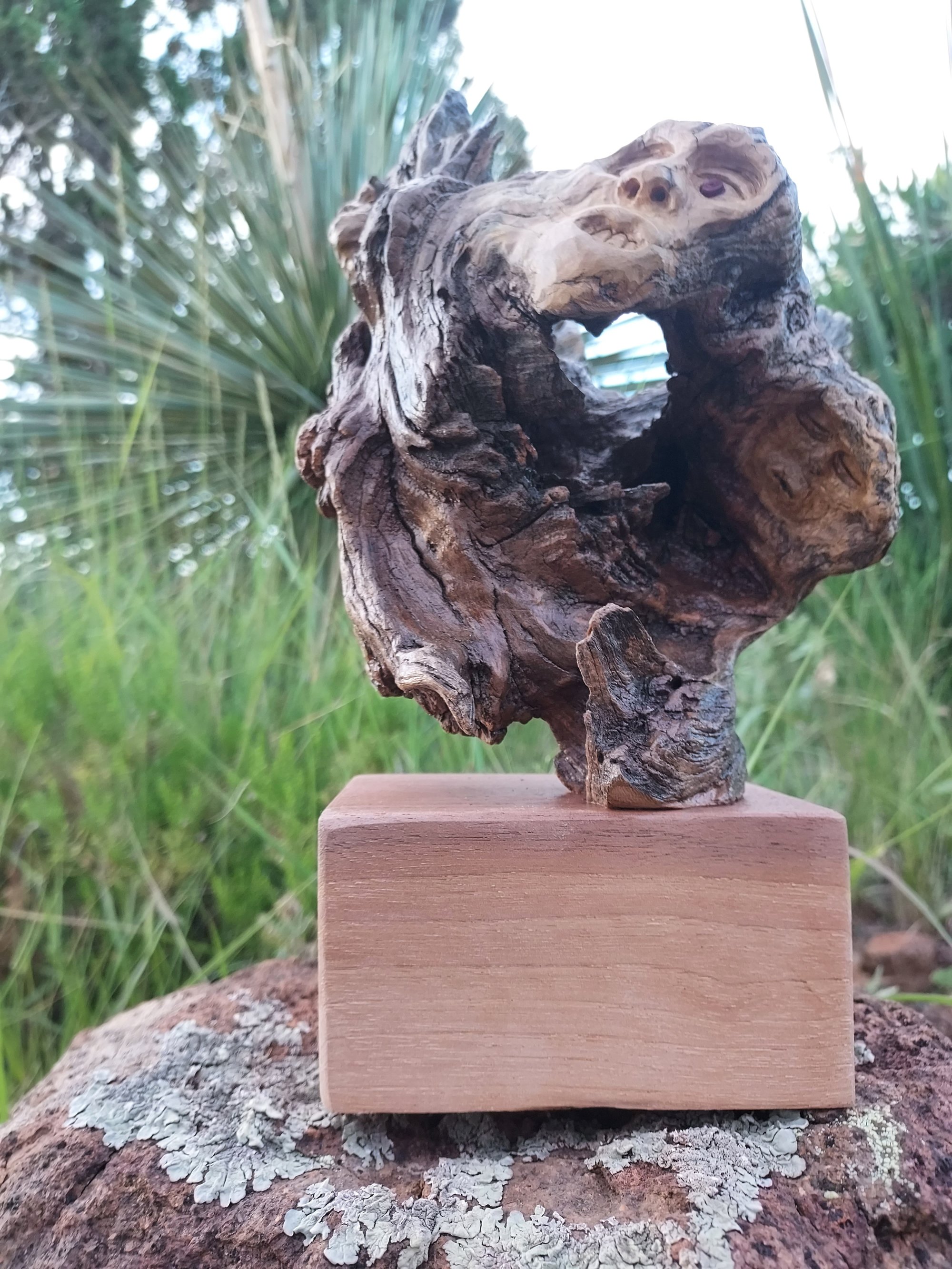 This one is carved from an ancient piece of Emory Oak. Time has done most the work, I just added a few things.