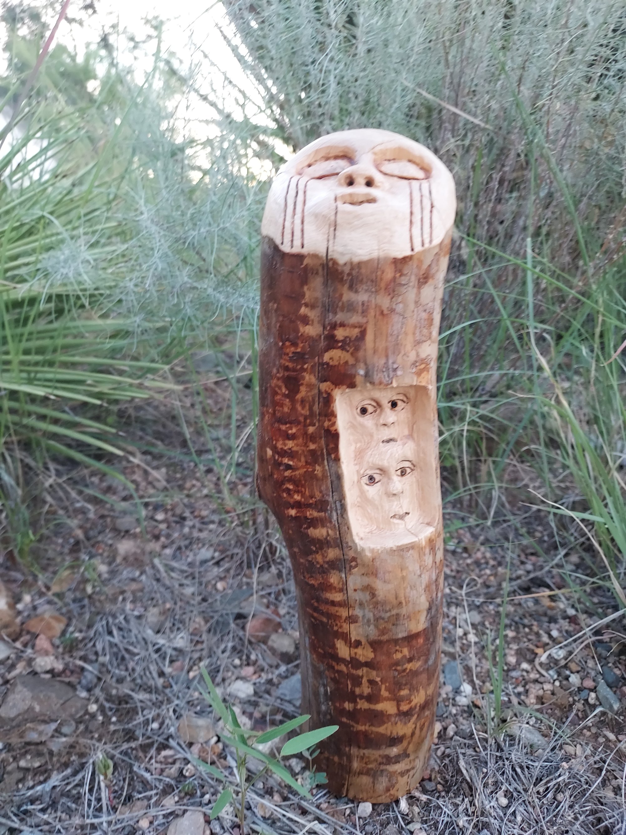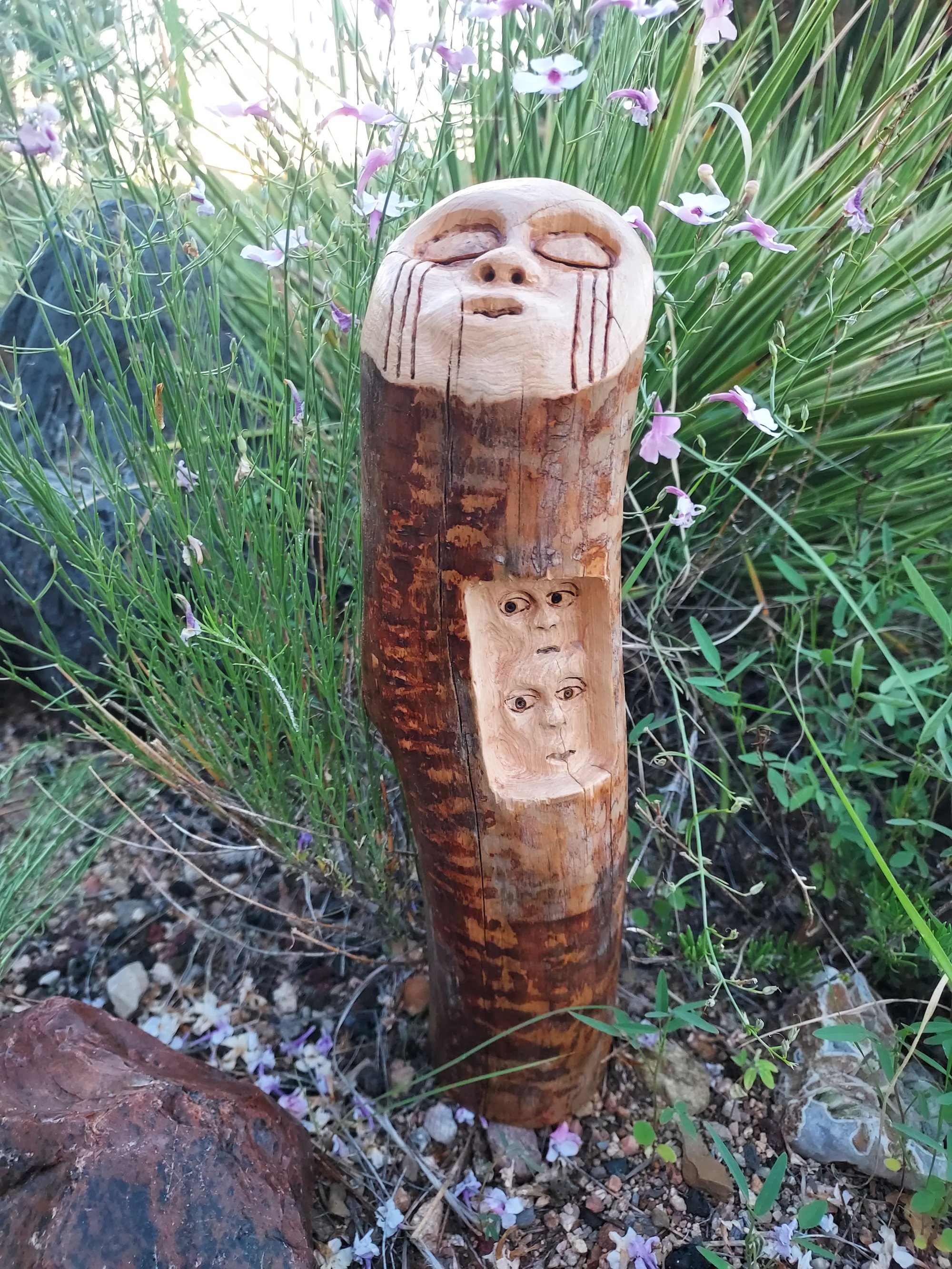 This is carved from a piece of Alligator Juniper. It came from my own grief watching how the world can treat the lives of our innocent children. i cling to hope that one day we will learn.